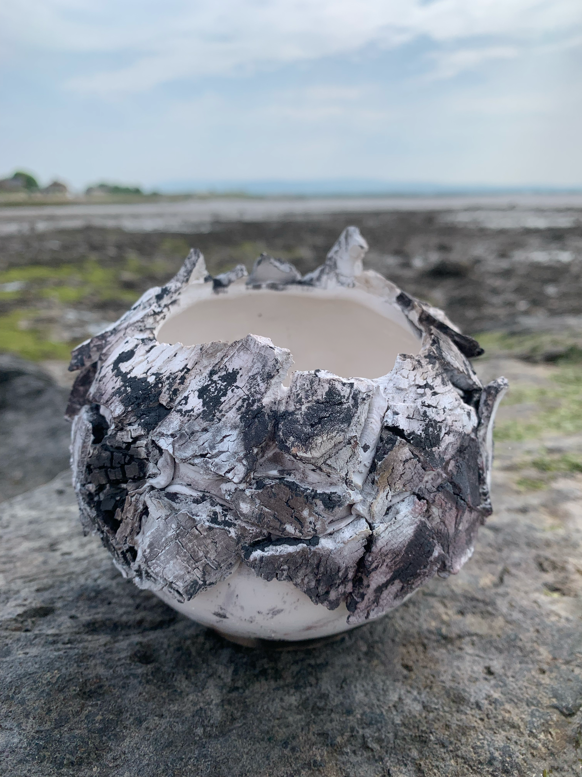Kurt’s Earth Jars are inspired by textures and forms found in nature. Using porcelain for its traditional white body, Kurt has focused on using a multitude of techniques to create his pit fired forms. Kurt finishes his Earth jars in fire, using locally sourced fell wood and driftwood. Organic materials add flashes of colour, creating a sustainable and more eco friendly way to create high quality ceramic art.